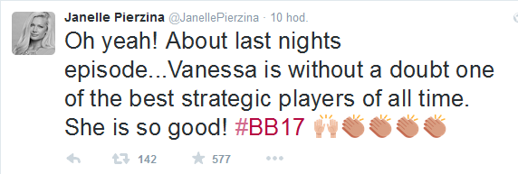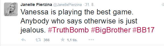 Když si projdu všechny série, co jsem viděl (a uznávám, že jsou to snad až na 2, 6, 7 série, kde ženy byly prostě slabé, promiň Danielle D a Britney), tak je pro mě Vanessa na prvním místě spolu s Janelle, dokonce bych řekl, že čistě strategicky je Vanessa i lepší, na druhou stranu Janelle je na úplně opačném pólu co se týče působení na diváky. Právě od Janelle jsem okopíroval některé tweety týkající se Vanessy